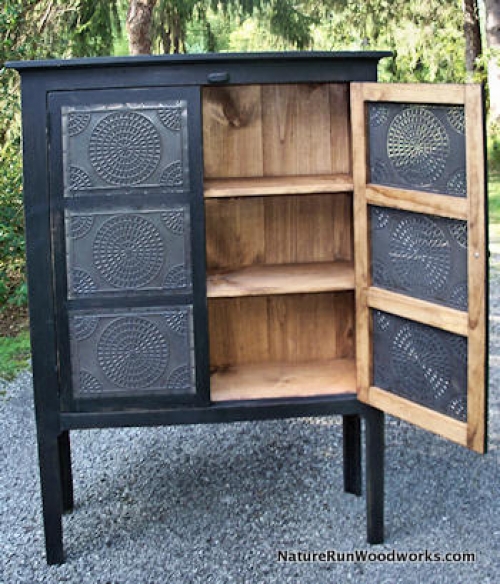 Pennsylvania Pie Safe This Pie Safe will bring back memories from the past. It measures 58" high, 41" Wide and 12 1/2 inches deep. The punched tins are tacked on the front like the antiques pie safes from the 1800's. This Pie Safe was stained Early American and painted Black. (Different punch tin patterns are available)