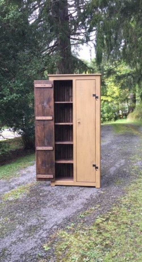 The Plymouth Pantry Our Plymouth Pantry Measures 76" high, 34" wide & 12" deep. Finished in dark walnut stain & painted Valley Forge Mustard this pantry has lots of storage space for just about whatever you can put in it. We finished this piece off with Rat Tail Hinges.